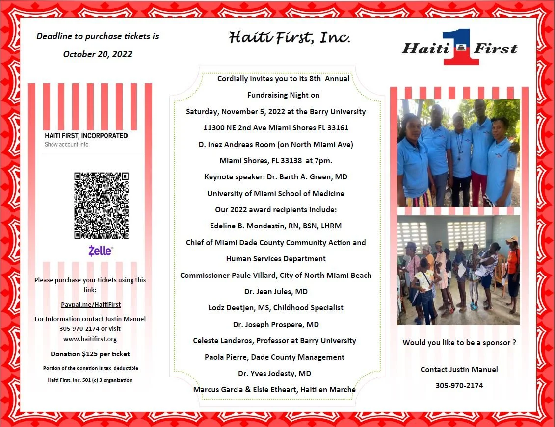 Posing for a photo after Haiti First's seventh annual Fundraising Cultural Night, held Nov. 16, 2019 in Miami Shores, are, from left: Father Franckel Fenelus, pastor of St. Joseph Parish in Lozier, Haiti; Justin Manuel, Haiti First founder; Archbishop Thomas Wenski; Myriam Mezadieu and Randolph McGrorty of Catholic Legal Services.